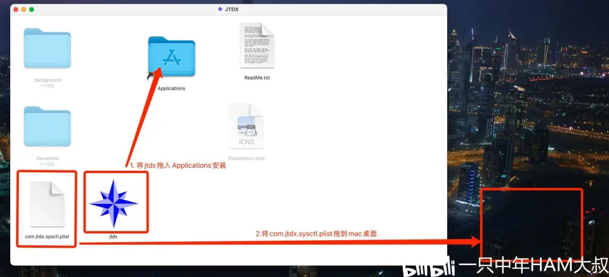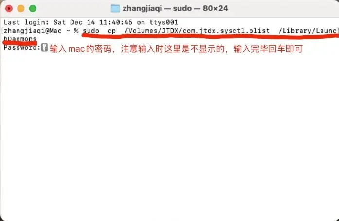 将以下代码复制到终端内,然后回车: sudo cp /Volumes/JTDX/com.jtdx.sysctl.plist /Library/LaunchDaemons