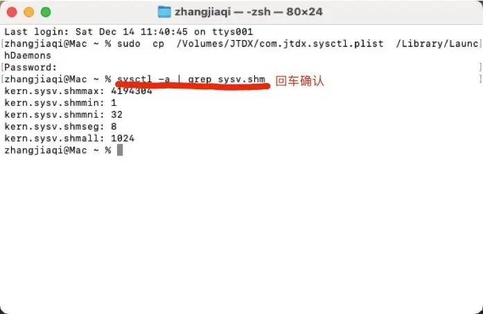 再将一下代码复制入终端内,回车: sysctl -a | grep sysv.shm